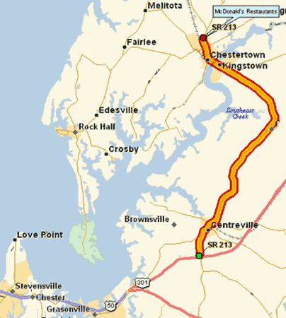 From the DC Beltway (495) take Route 50 east (which joins Route 301) towards Annapolis and cross the Chesapeake Bay Bridge ($2.50 toll eastbound, EZ Pass accepted) to Maryland's Eastern Shore. Route 301 north splits away from Route 50 beyond Grasonville. Continue on Route 301 north until you reach State Route 213...